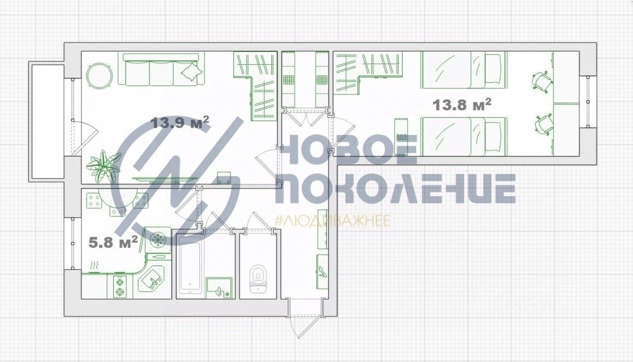 Компания недвижимости ''Новое поколение'' предлагает к продаже 2к квартиру.