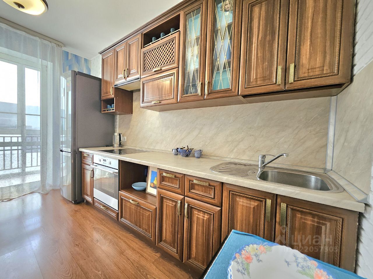 Кухня с выходом на застекленную лоджию. В кухне - кухонный гарнитур со встроенной бытовой техникой: варочная поверхность, духовой шкаф, вытяжка, холодильник.
