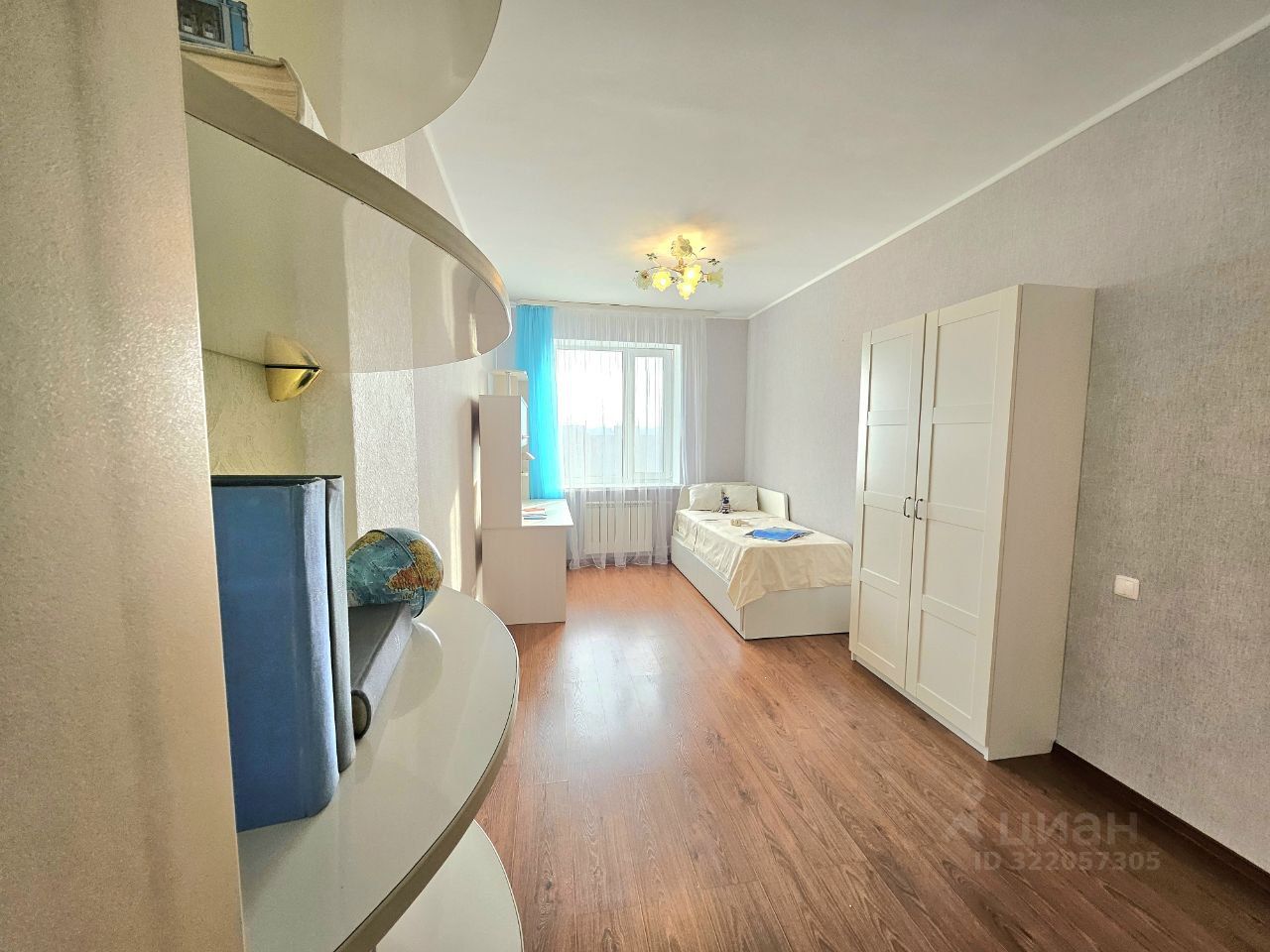 На потолке гостиной расположена гардина: можно зонировать пространство шторой, отделив гостиную от прохода из кухни в спальную комнату.