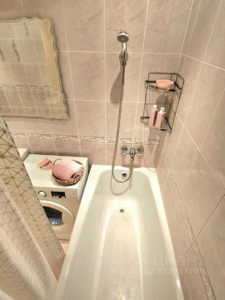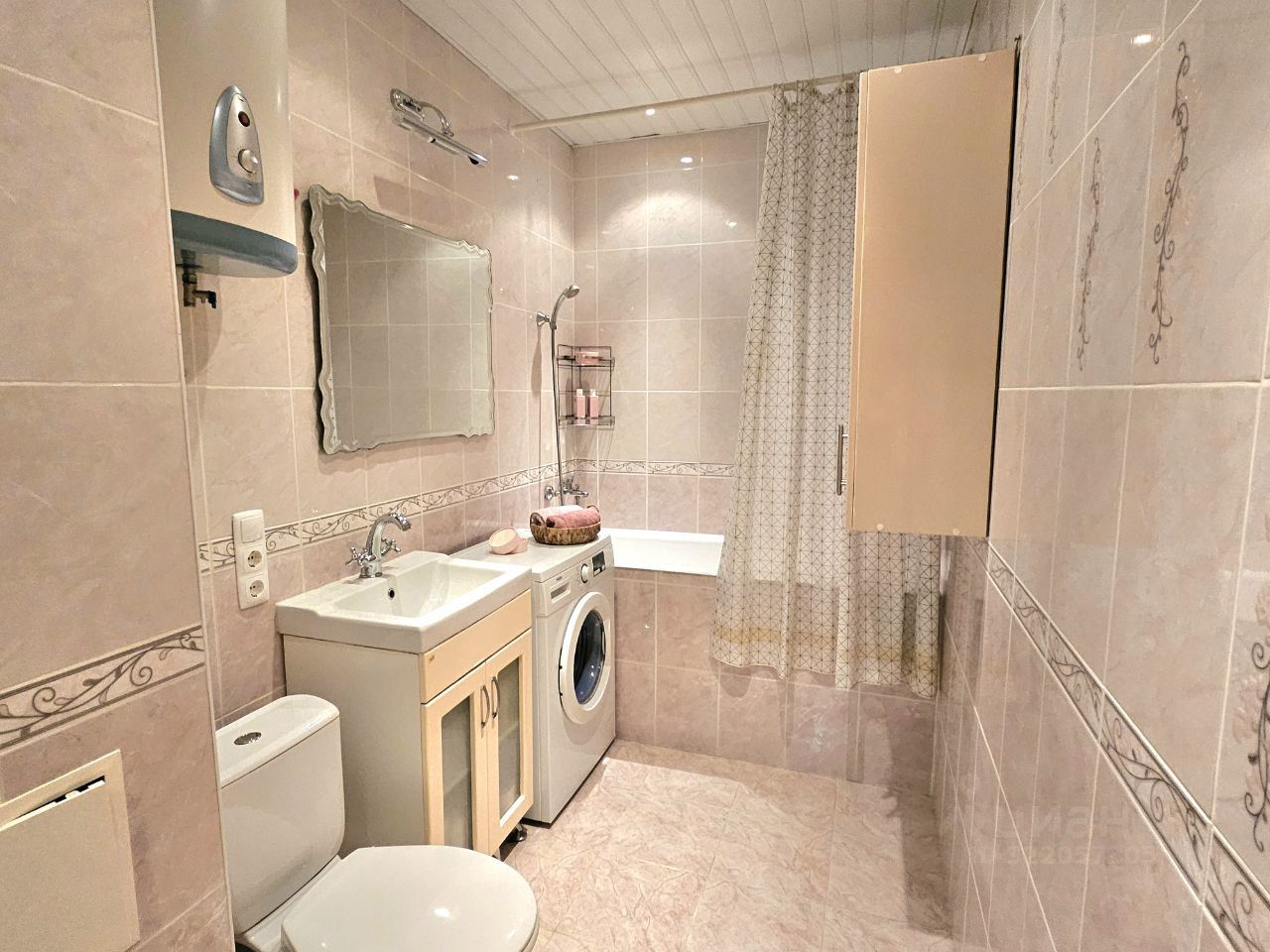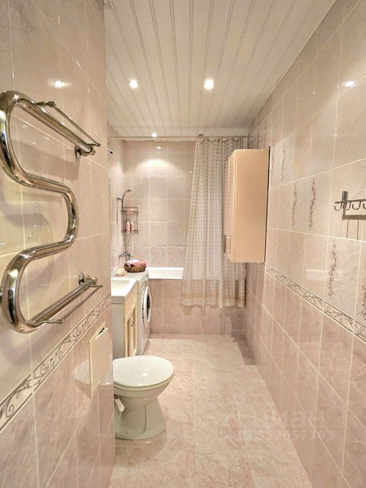 Просторная ванная комната со стиральной машиной, ванной, полотенцесушителем.