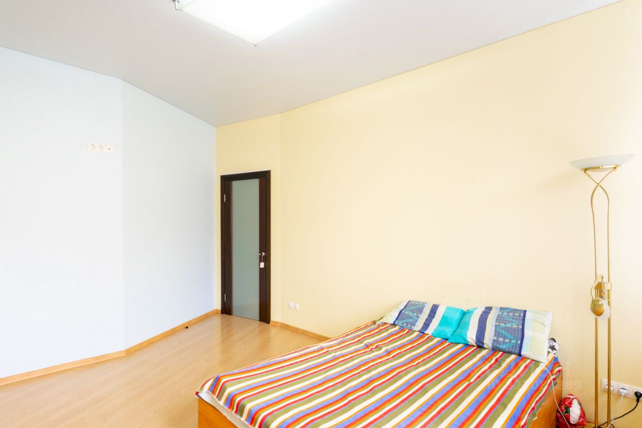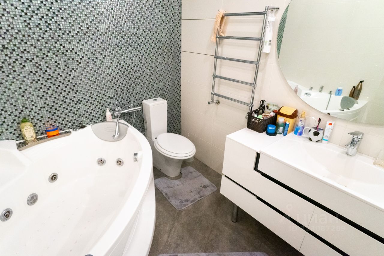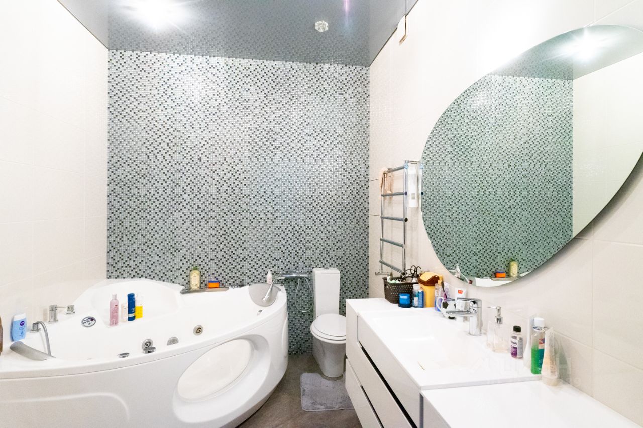 Выровнены стены, установлено два кондиционера, теплые полы в спальне, на кухне и на балконе. Так же во всей квартире натяжные потолки и ламинат на полу. Ванные комнаты облицованы кафелем, установлена современная сантехника.