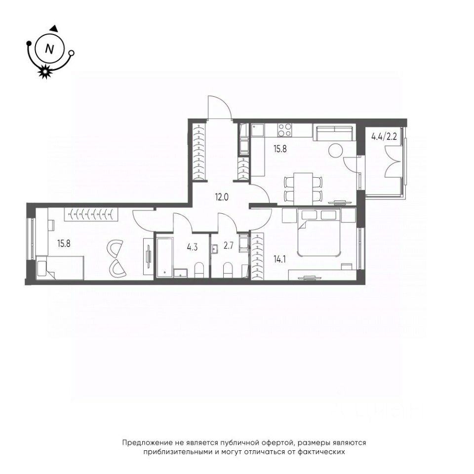 Комнаты — 15,8 и 14,1 м²