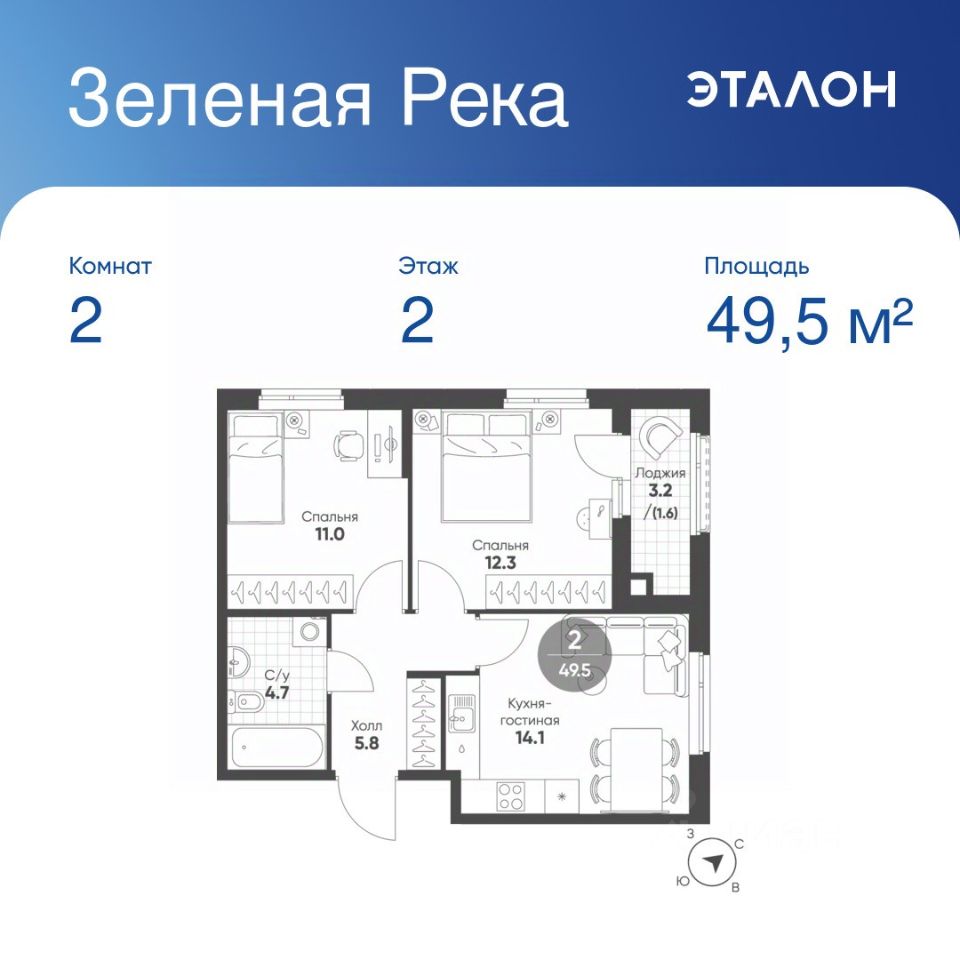 Общая площадь квартиры — 49.5 кв. м, этаж 2 из 11.