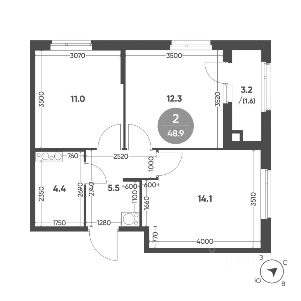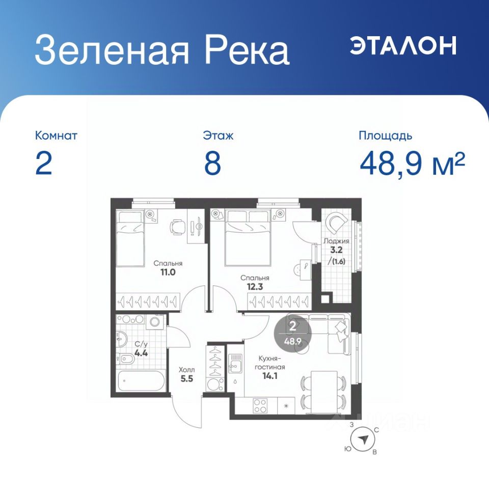 Общая площадь квартиры — 48.9 кв. м, этаж 8 из 11.