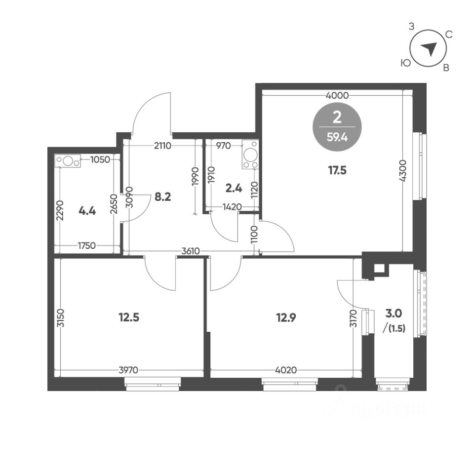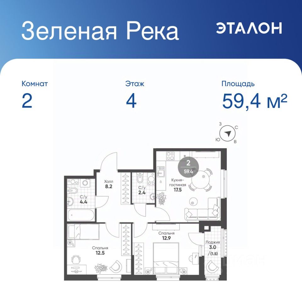 Общая площадь квартиры — 59.4 кв. м, этаж 4 из 11.