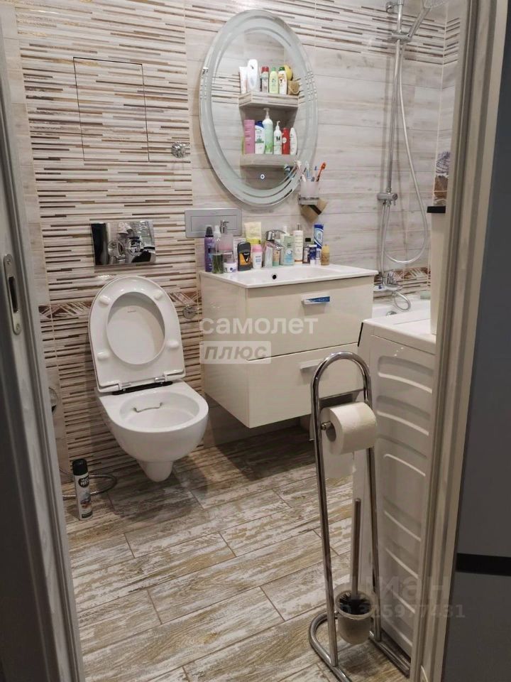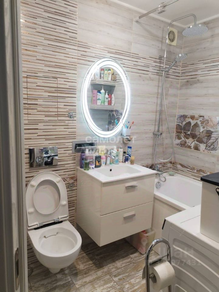 -санузел совмещенный, оформлен современной плиткой, установлена ванна, гигиенический душ