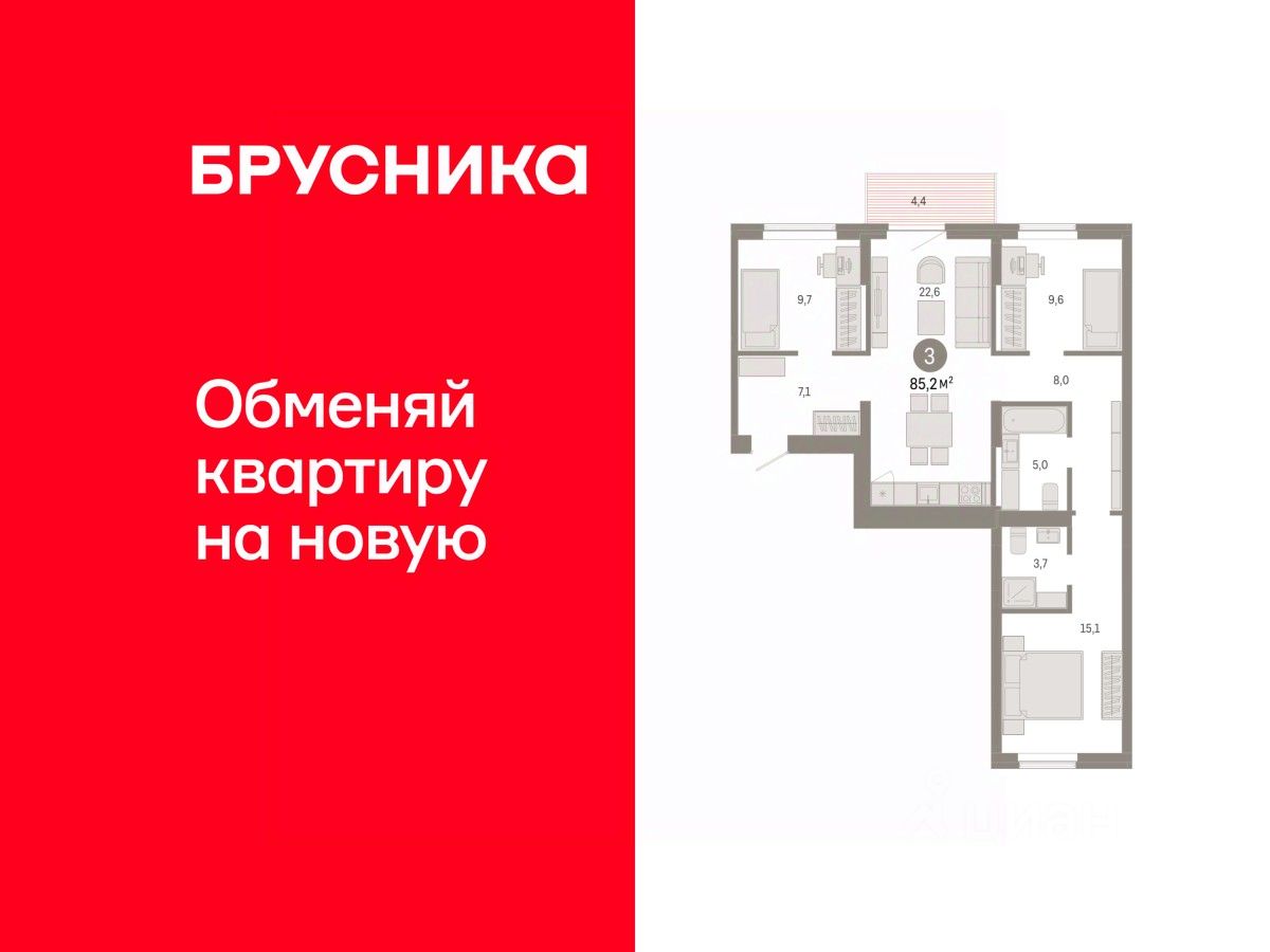 Квартира с кухней-гостиной и тремя спальнями в Кварталах Драверта. Особенности планировки: балкон, вид во двор, мастер-спальня, окна на две стороны, предчистовая отделка, разнесённые спальни.