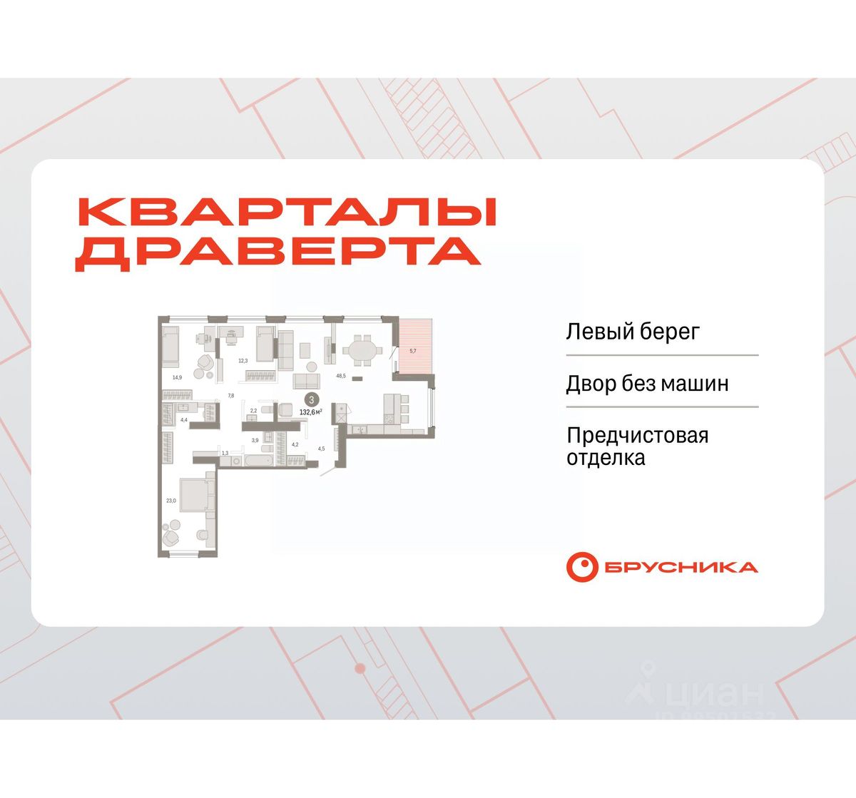 Просторная 3-комн. квартира с предчистовой отделкой в Кварталы Драверта на 9 этаже. Общая площадь: 132.59 кв.м. Высота потолков 2.7 м.