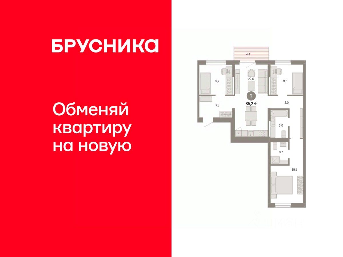 Квартира с кухней-гостиной и тремя спальнями в Кварталах Драверта. Особенности планировки: балкон, окна на две стороны, предчистовая отделка, разнесённые спальни.