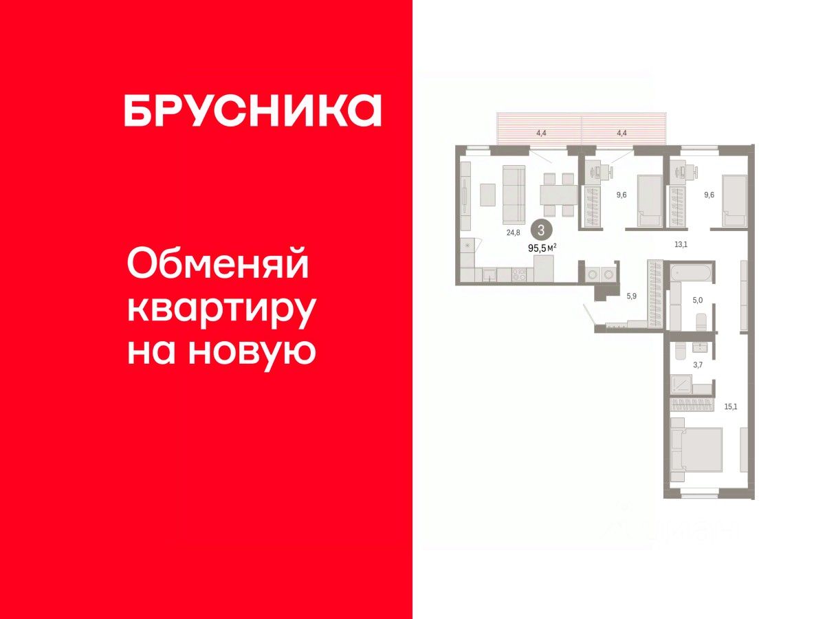 Квартира с кухней-гостиной и тремя спальнями в Кварталах Драверта. Особенности планировки: балкон, окна на две стороны, предчистовая отделка, разнесённые спальни.