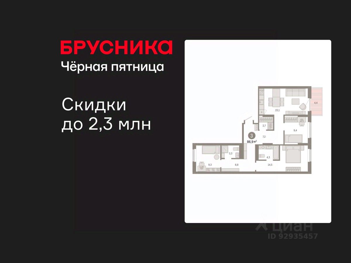 Квартира с кухней-гостиной и тремя спальнями в Кварталах Драверта. Особенности планировки: окна на две стороны, гардеробная, вид во двор, разнесённые спальни, предчистовая отделка, мастер-спальня, балкон.