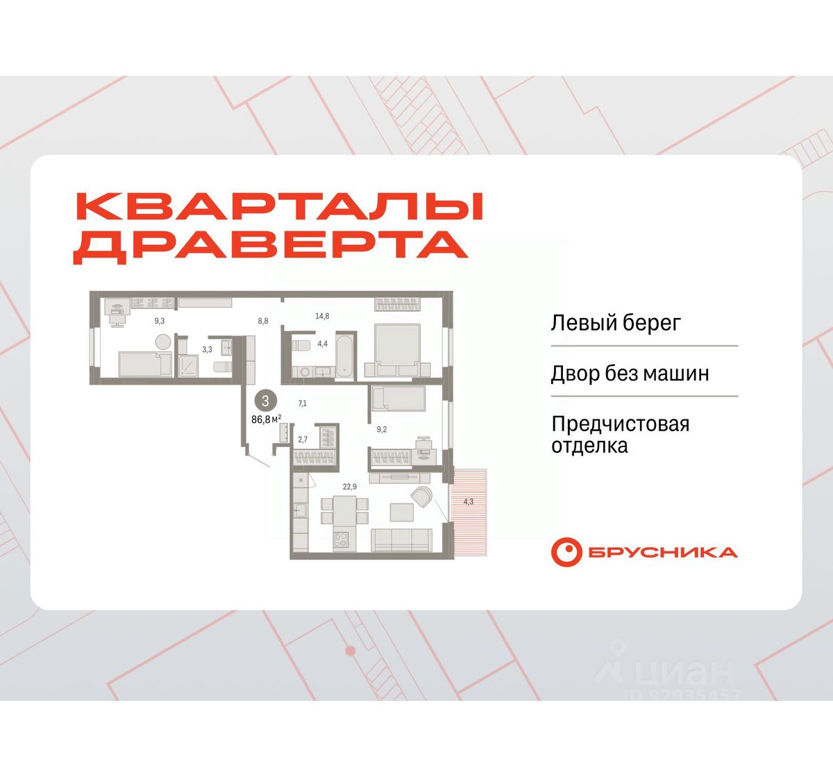 Квартира с кухней-гостиной и тремя спальнями в Кварталах Драверта. Особенности планировки: ипотека 4,6%, окна на две стороны, гардеробная, вид во двор, разнесённые спальни, предчистовая отделка, мастер-спальня, балкон.