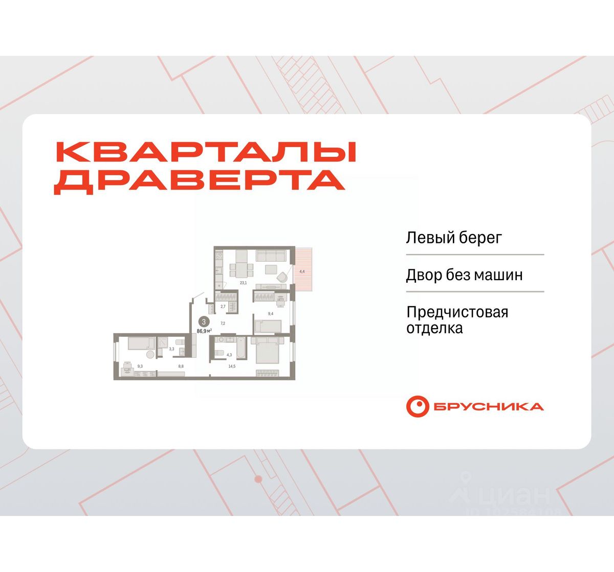 Квартира с кухней-гостиной и тремя спальнями в Кварталах Драверта. Особенности планировки: балкон, вид во двор, гардеробная, мастер-спальня, окна на две стороны, предчистовая отделка, разнесённые спальни.