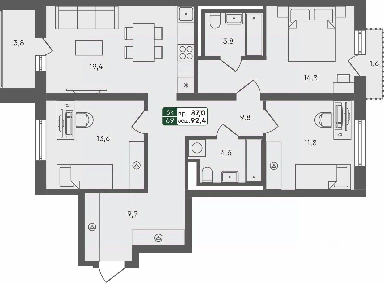 Продаётся 3-комнатная квартира в строящемся доме (ГП 1.1), срок сдачи: IV-кв. 2025, общей площадью 92.4 кв.м., на 3 этаже.
