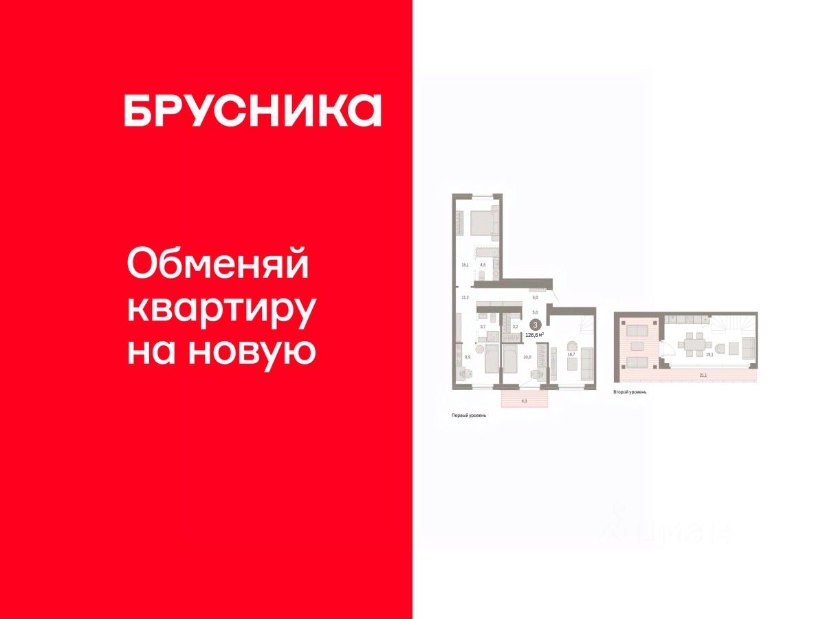 Двухуровневая квартира с кухней-гостиной и тремя спальнями в Кварталах Драверта. Особенности планировки: балкон, двухуровневая, предчистовая отделка, разнесённые спальни, терраса на крыше.