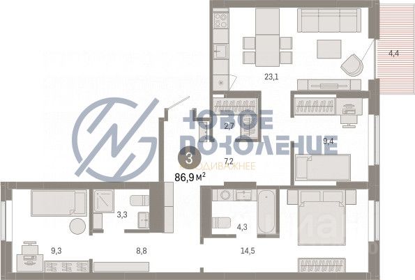 Рациональное разделение пространства: кухня-гостиная, три полноценные спальни, предусмотренное место для хранения вещей, совмещенный санузел и просторный балкон.