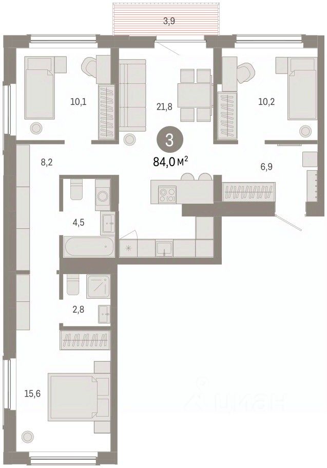 Квартира с кухней-гостиной и тремя спальнями в Кварталах Драверта. Особенности планировки: кладовая в подарок, вид во двор, разнесённые спальни, предчистовая отделка, мастер-спальня, балкон.