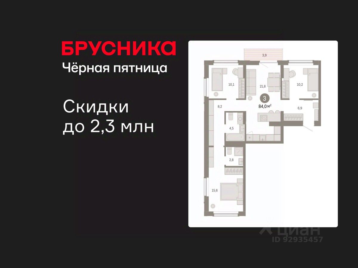 Квартира с кухней-гостиной и тремя спальнями в Кварталах Драверта. Особенности планировки: вид во двор, разнесённые спальни, предчистовая отделка, мастер-спальня, балкон.