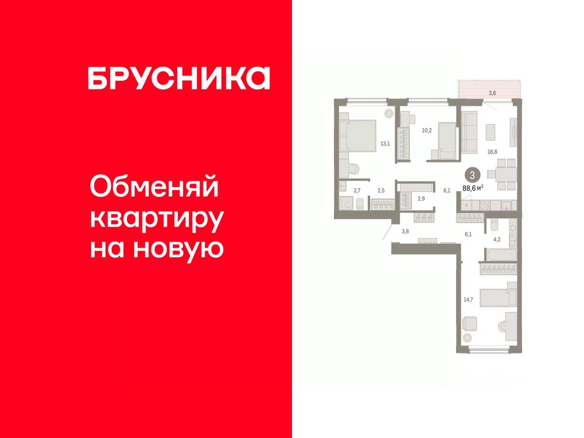 Квартира с кухней-гостиной и тремя спальнями в Кварталах Драверта. Особенности планировки: балкон, окна на две стороны, предчистовая отделка, разнесённые спальни.