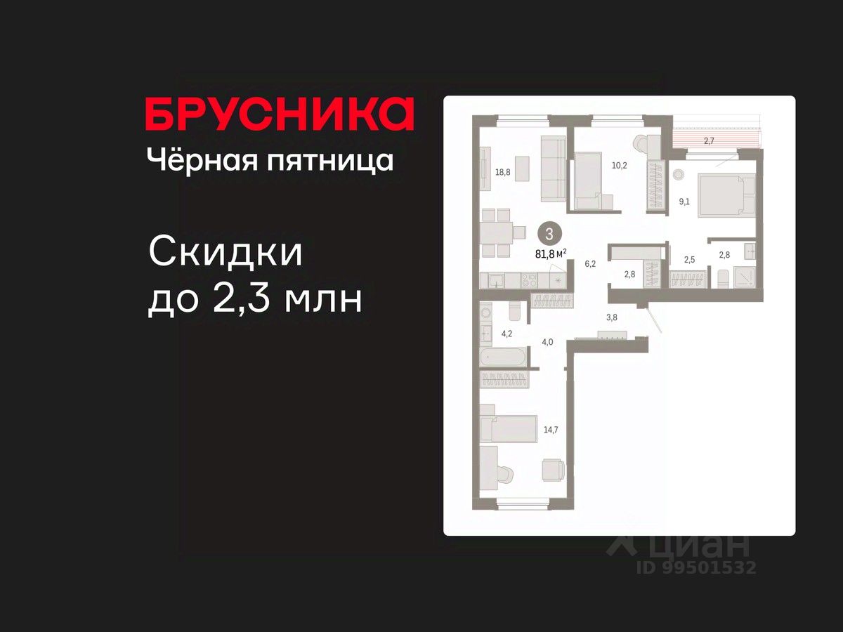 Просторная 3-комн. квартира с предчистовой отделкой в Кварталы Драверта на 8 этаже. Общая площадь: 81.84 кв.м. Высота потолков 2.82 м.