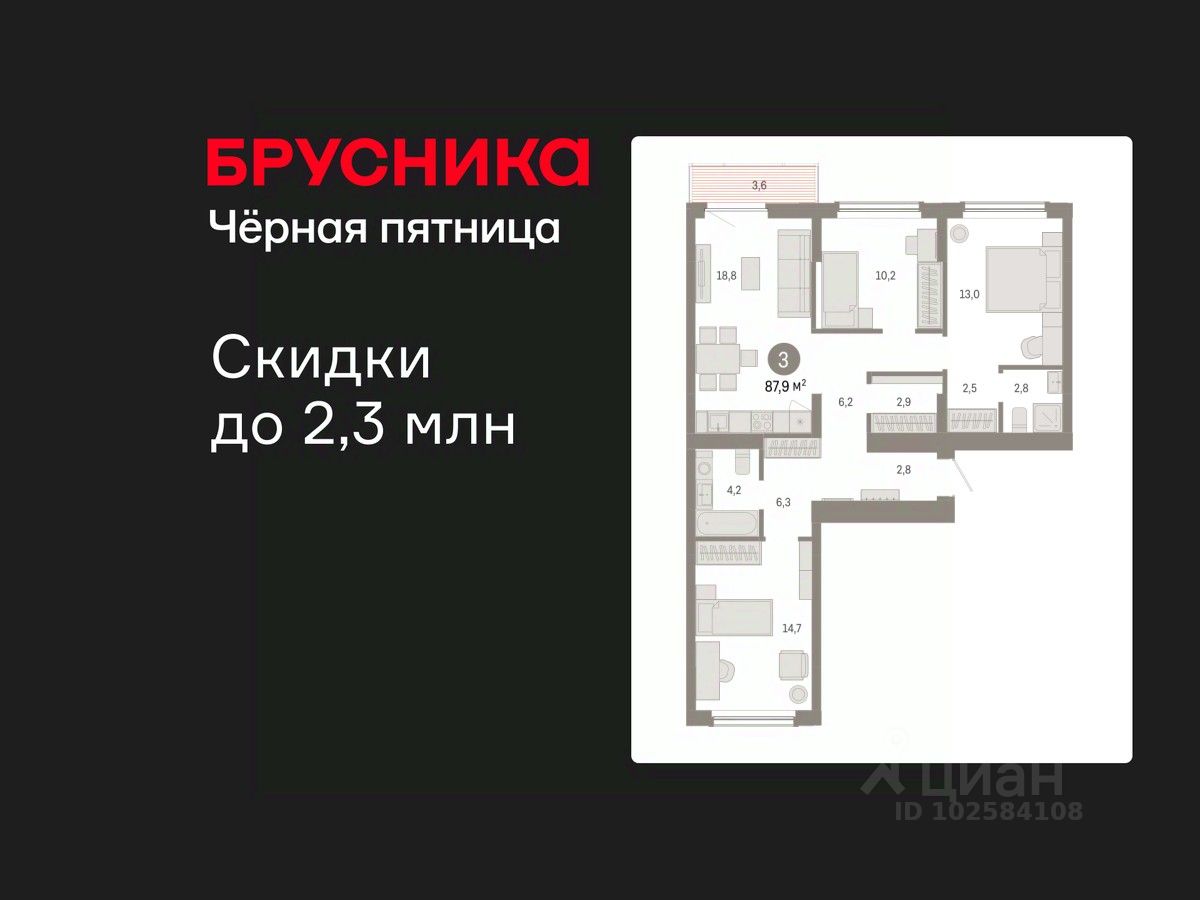 Трехкомнатная квартира от застройщика с предчистовой отделкой в Кварталы Драверта на 6 этаже. Общая площадь: 87.86 кв.м., жилая: 37.9 кв.м., площадь просторной кухни-гостиной: 18.8 кв.м. Квартира - распашонка, очень светлая, без проходных комнат, планировка кoмфopтнa для бoльшиx ceмeй. В квартире один балкон, два совмещенных санузла. Высота потолков 2.82 м.