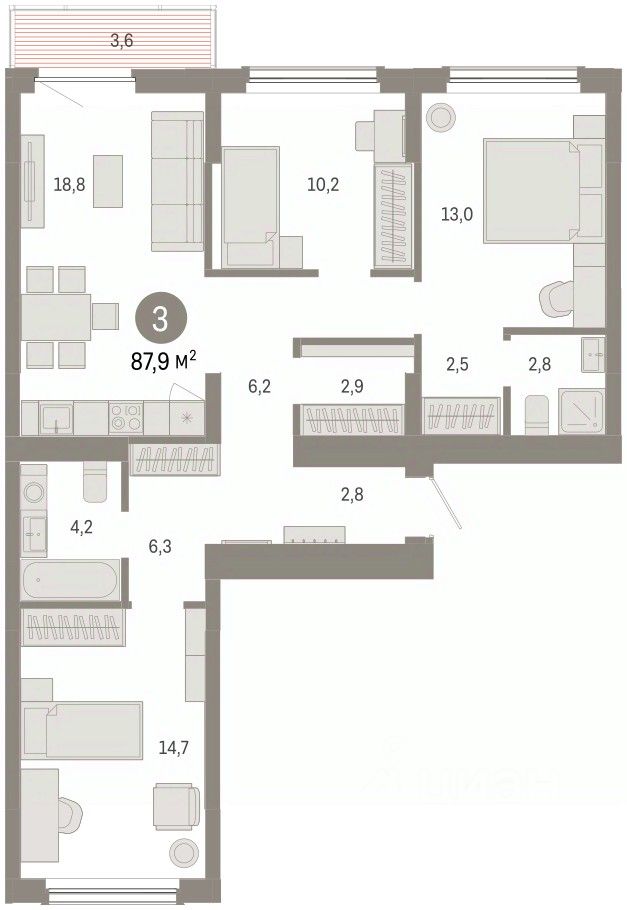 Квартира с кухней-гостиной и тремя спальнями в Кварталах Драверта. Особенности планировки: окна на две стороны, гардеробная, вид во двор, разнесённые спальни, предчистовая отделка, мастер-спальня, балкон.