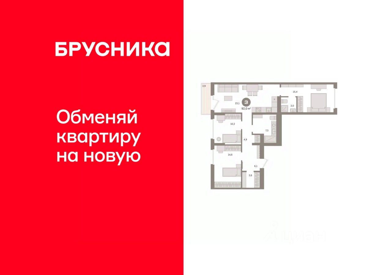Квартира с кухней-гостиной и тремя спальнями в Кварталах Драверта. Особенности планировки: балкон, окна на две стороны, предчистовая отделка, разнесённые спальни.