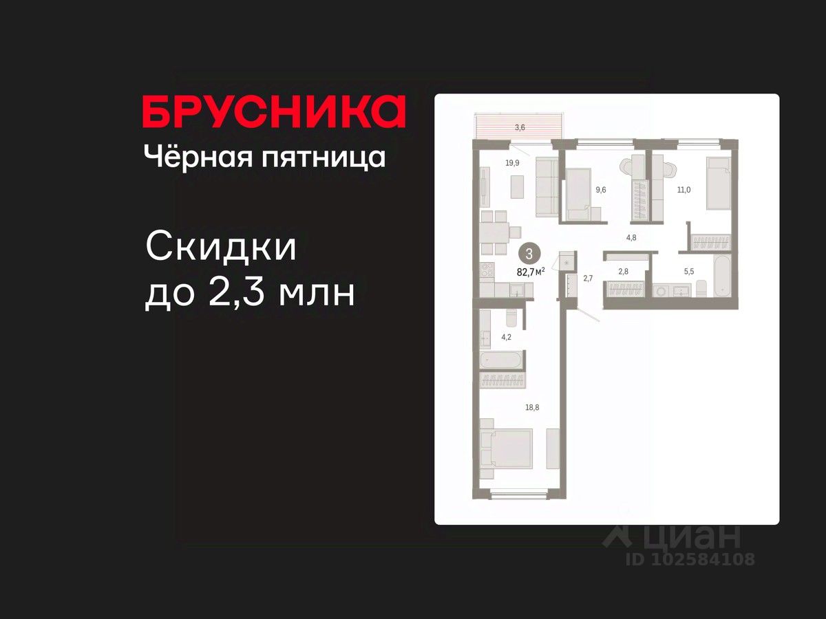 Просторная 3-комн. квартира с предчистовой отделкой в Кварталы Драверта на 4 этаже. Общая площадь: 82.67 кв.м. Высота потолков 2.82 м.