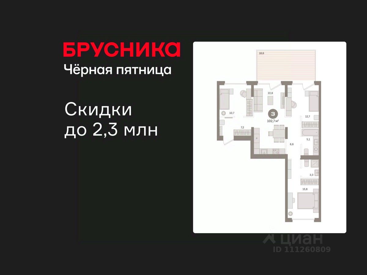 Квартира с кухней-гостиной и тремя спальнями в Кварталах Драверта. Особенности планировки: окна на две стороны, окна в пол, вид во двор, панорамное остекление, свободная планировка, разнесённые спальни, мастер-спальня, терраса.