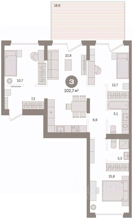 3-комн. квартира с предчистовой отделкой в Кварталы Драверта на 2 этаже. Общая площадь: 102.68 кв.м. Высота потолков 2.82 м.