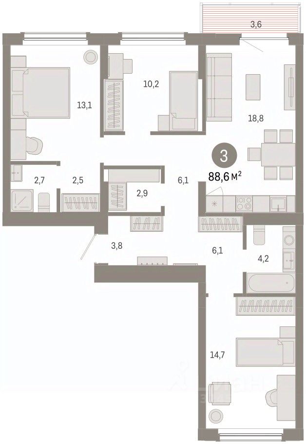 Квартира с кухней-гостиной и тремя спальнями в Кварталах Драверта. Особенности планировки: окна на две стороны, гардеробная, вид во двор, разнесённые спальни, предчистовая отделка, мастер-спальня, балкон.