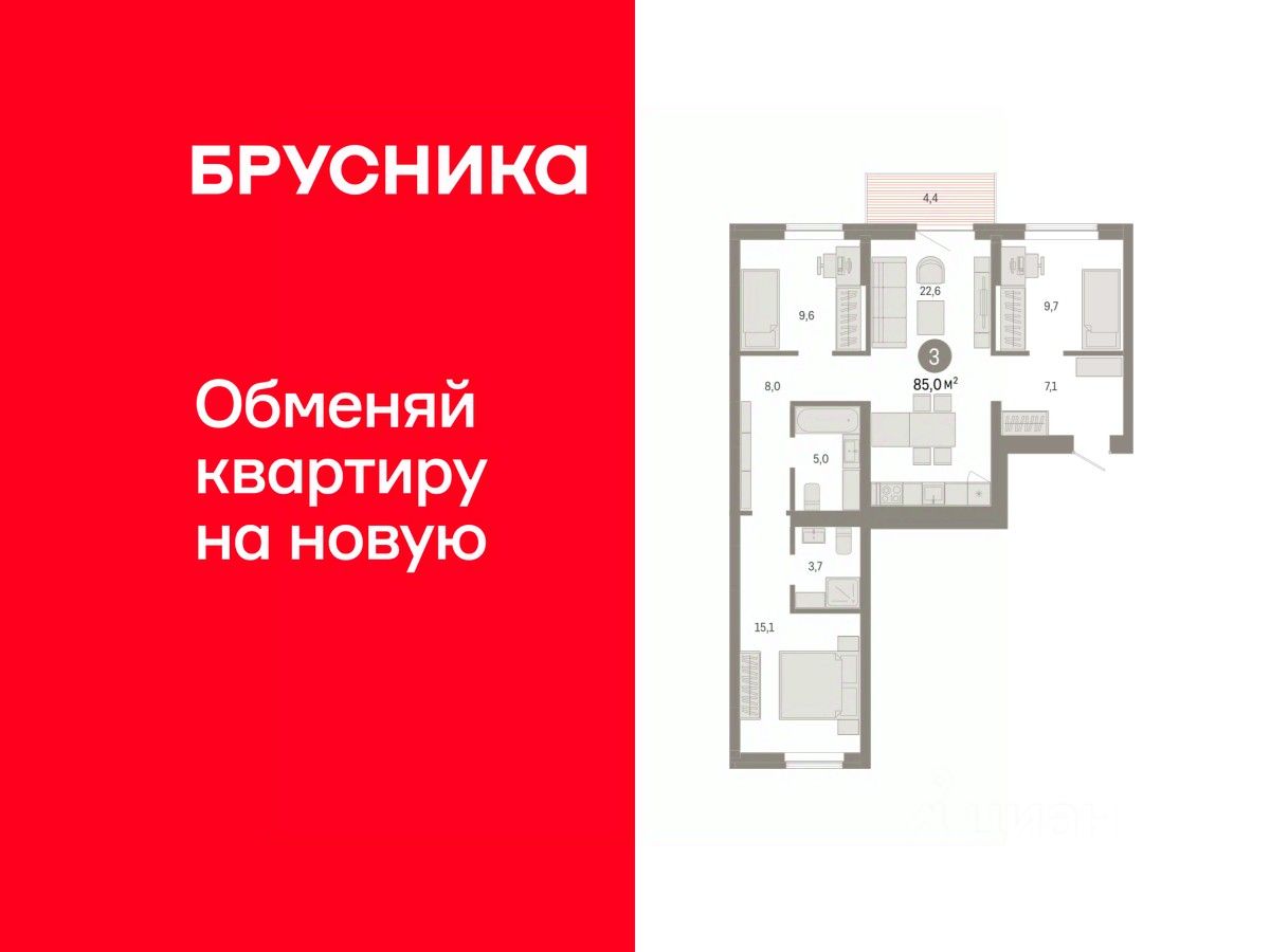 3-комнатная квартира, 85 м²