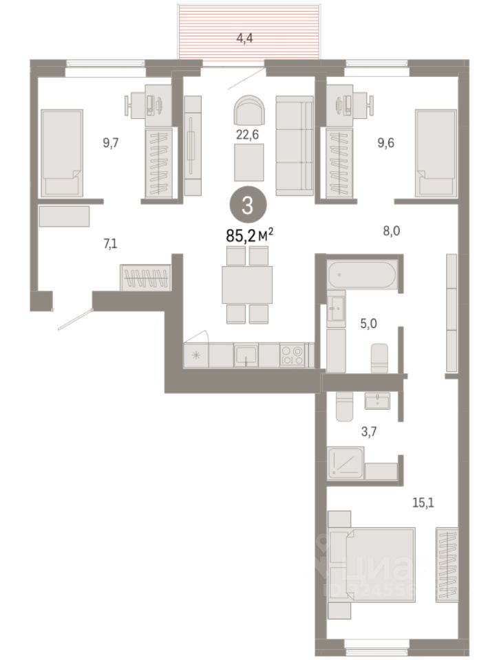 Квартира с кухней-гостиной и тремя спальнями в Кварталах Драверта. Особенности планировки: окна на две стороны, вид во двор, разнесённые спальни, предчистовая отделка, мастер-спальня, балкон.