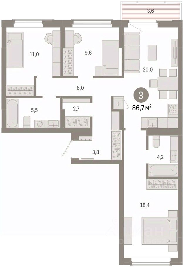 Квартира с кухней-гостиной и тремя спальнями в Кварталах Драверта. Особенности планировки: окна на две стороны, гардеробная, вид во двор, разнесённые спальни, предчистовая отделка, мастер-спальня, балкон.