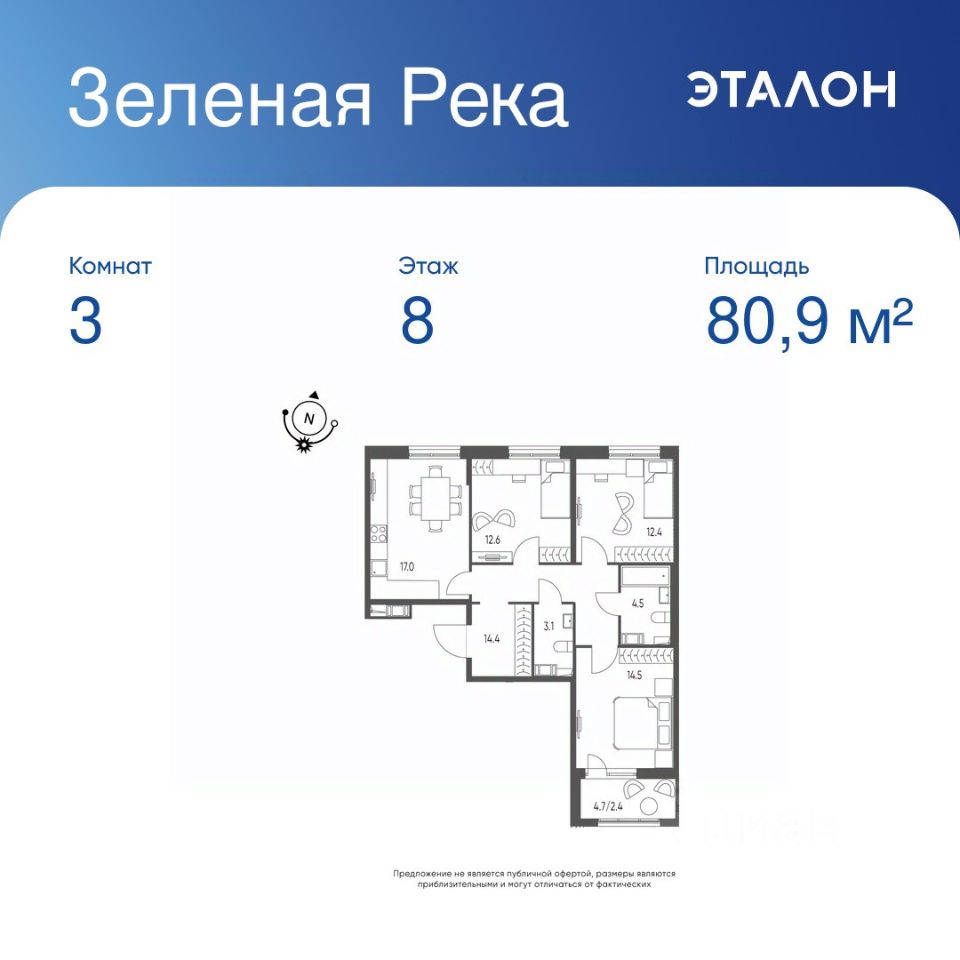 Общая площадь квартиры — 80.9 кв. м, этаж 8 из 9.