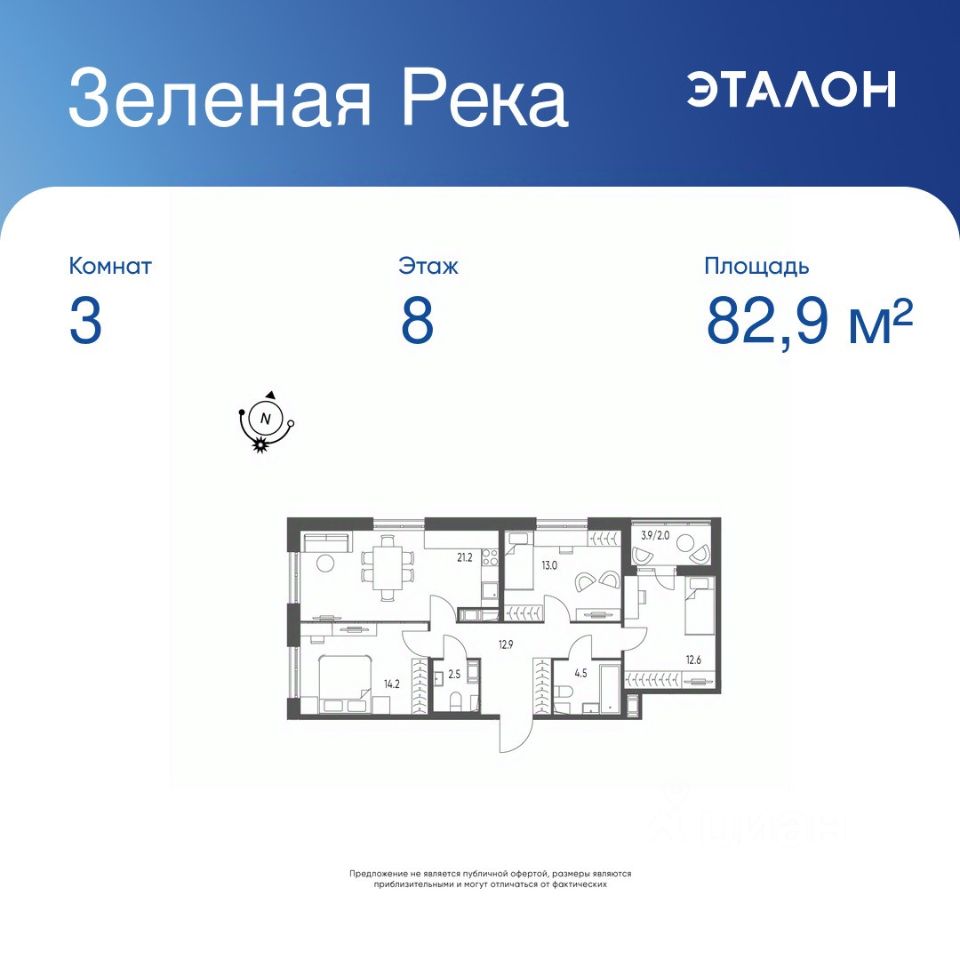 Общая площадь квартиры — 82.9 кв. м, этаж 8 из 9.
