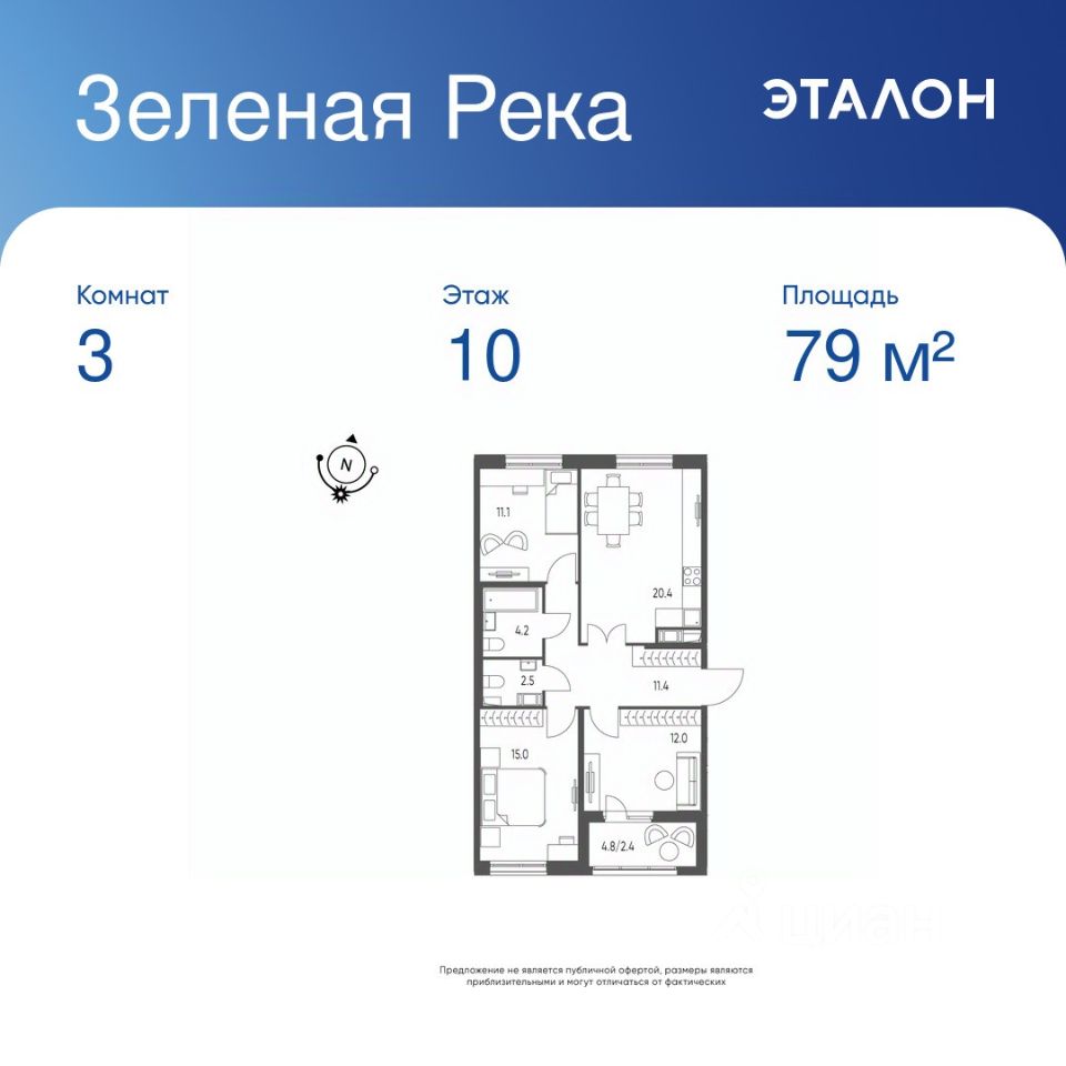 Общая площадь квартиры — 79 кв. м, этаж 10 из 10.