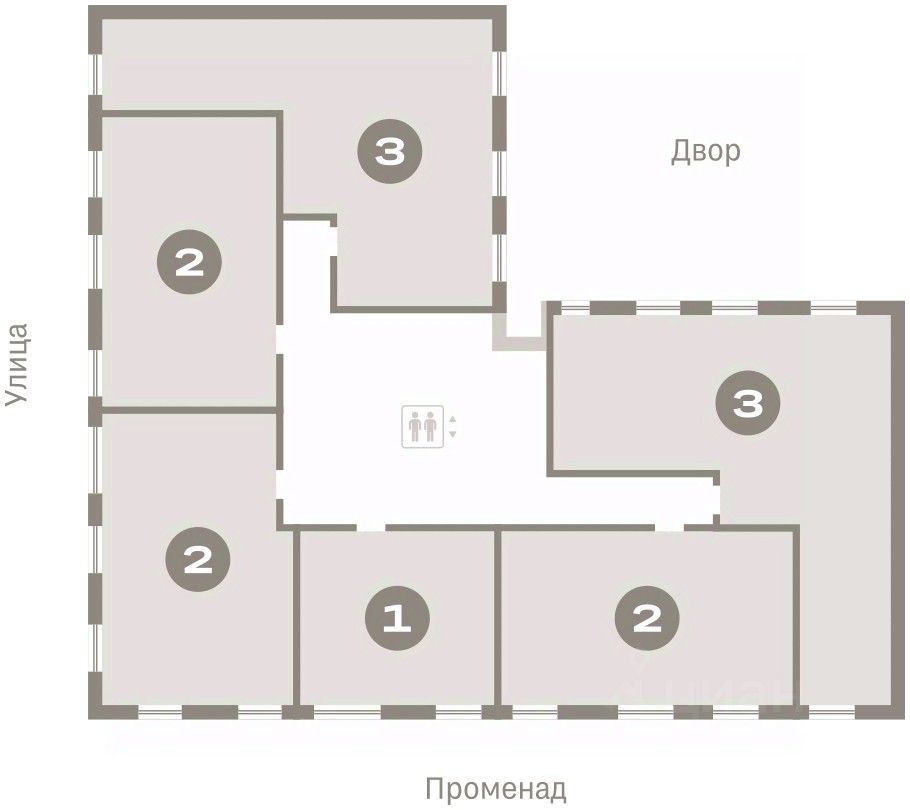 Квартира с кухней-гостиной и тремя спальнями в Кварталах Драверта. Особенности планировки: балкон, вид во двор, гардеробная, мастер-спальня, окна на две стороны, постирочная, предчистовая отделка, разнесённые спальни.
