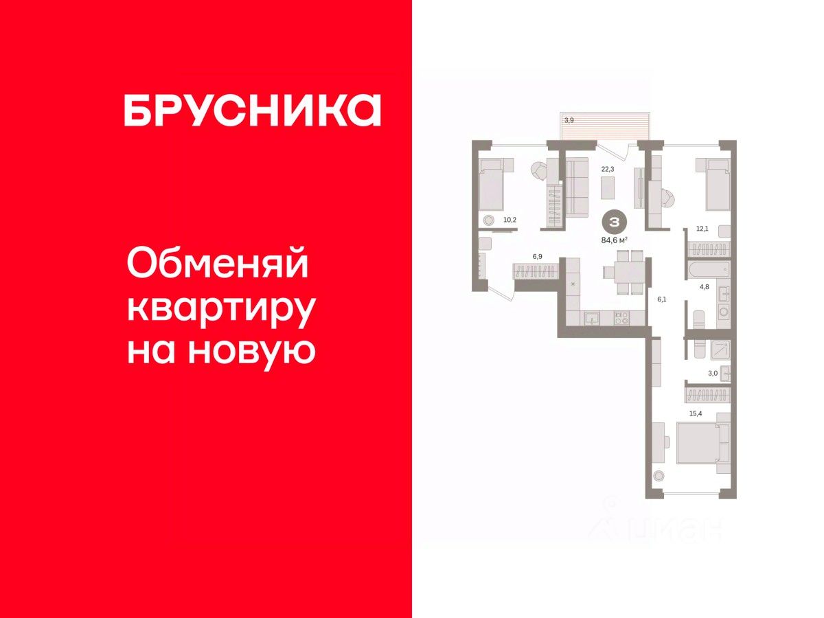 Квартира с кухней-гостиной и тремя спальнями в Кварталах Драверта. Особенности планировки: балкон, окна на две стороны, предчистовая отделка, разнесённые спальни.