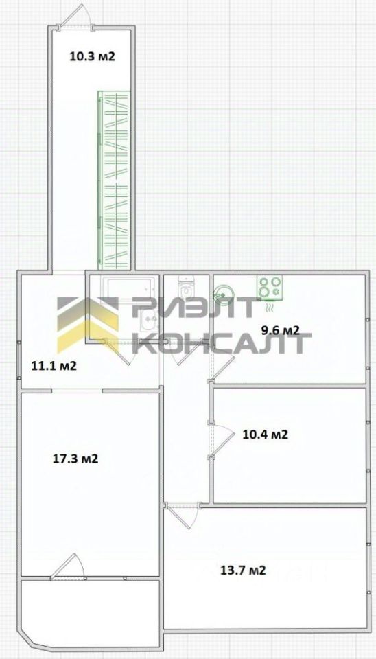 Удобная планировка включает в себя три изолированные комнаты 17,3, 10,4, 13,7 кв.м, просторную кухню 9,6 кв м, раздельный санузел (облицован кафелем), утепленная лоджия (пиноплекс, обшита вагонкой).
