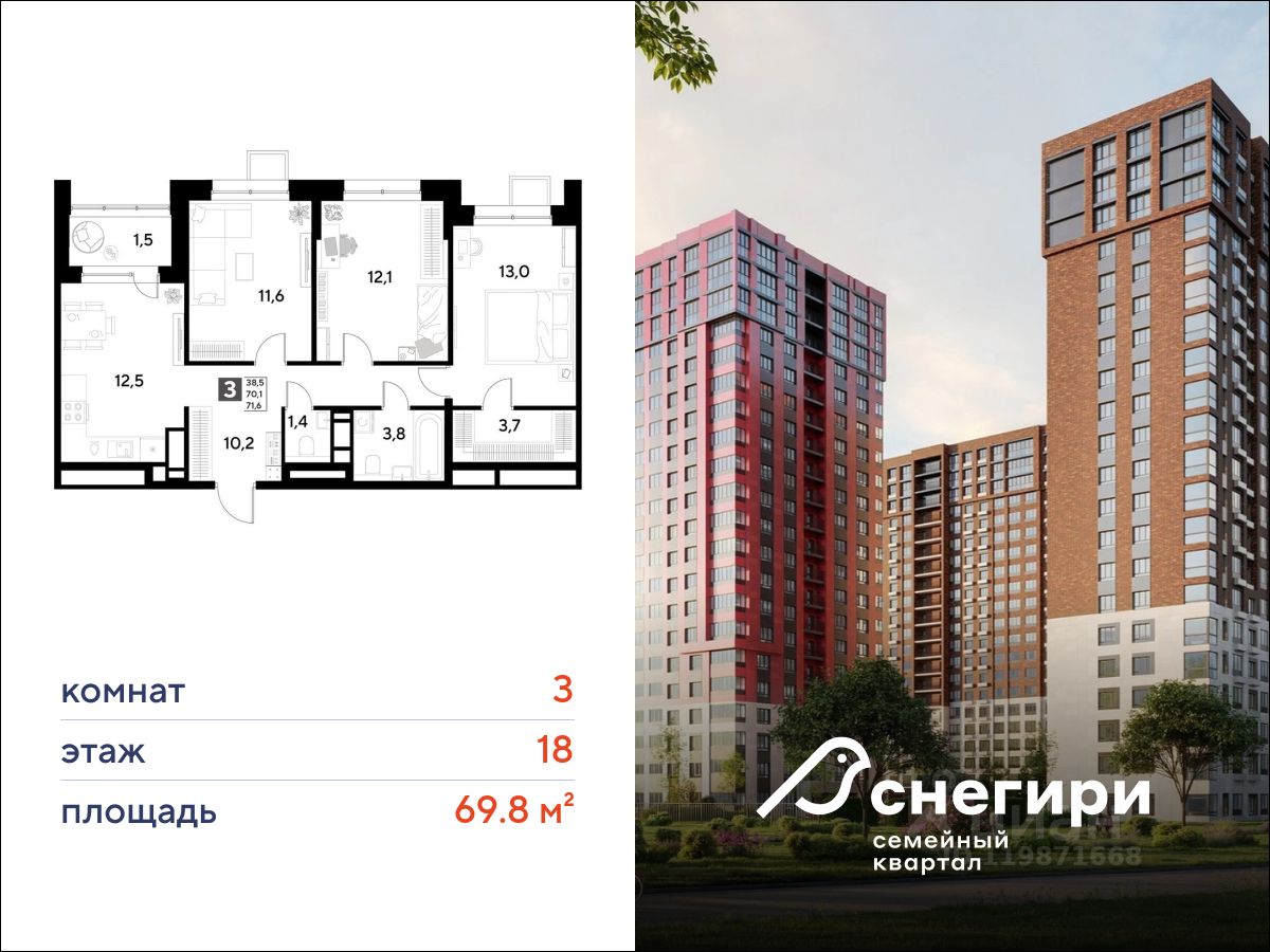 ЖК ''Снегири'', г. Омск, корпус 1 Срок сдачи: (4 кв. 2027, общей площадью 69.8 кв.м., на 18 этаже.)
