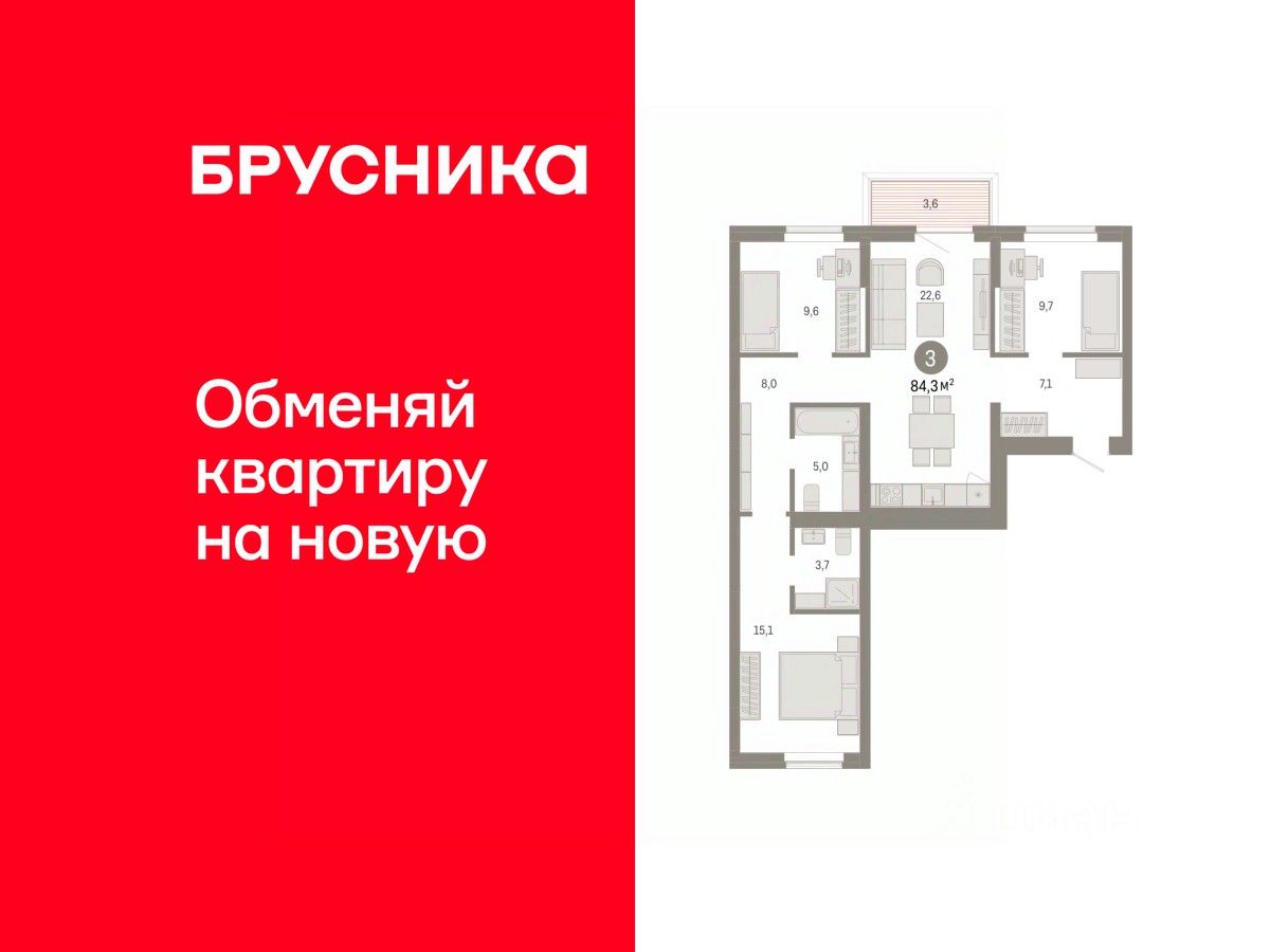 Квартира с кухней-гостиной и тремя спальнями в Кварталах Драверта. Особенности планировки: балкон, новые лоты, окна на две стороны, предчистовая отделка, разнесённые спальни.