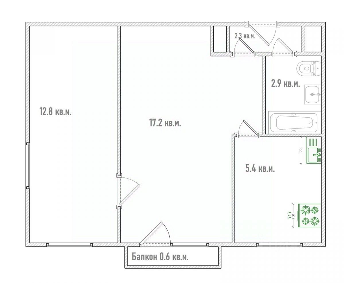 Изюминкой этой квартиры является наличие балкона, который можно обустроить под зону отдыха или небольшой зимний сад. Санузел совмещен, что позволяет максимально эффективно использовать пространство.