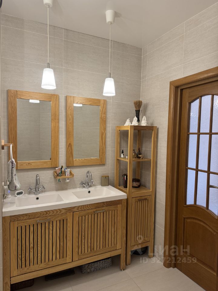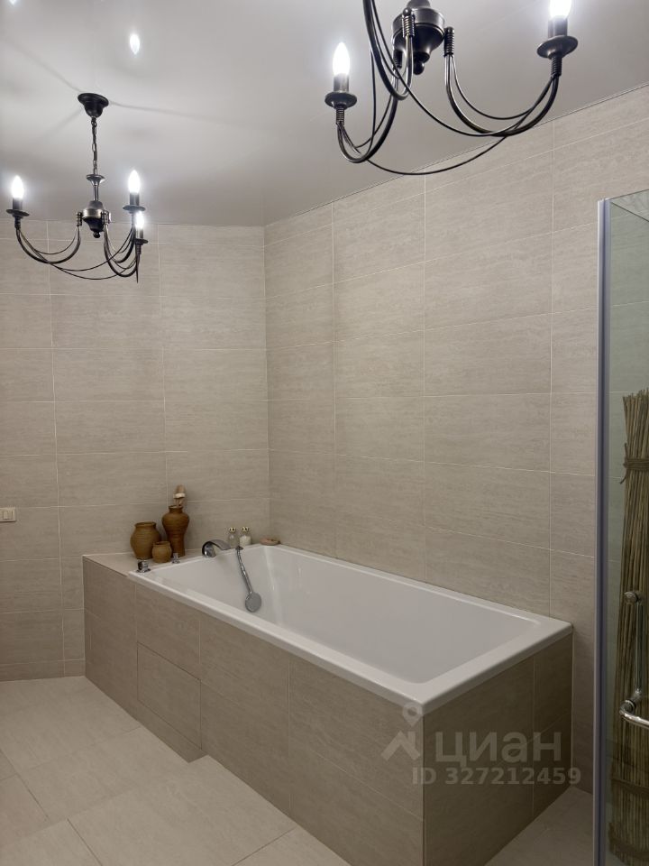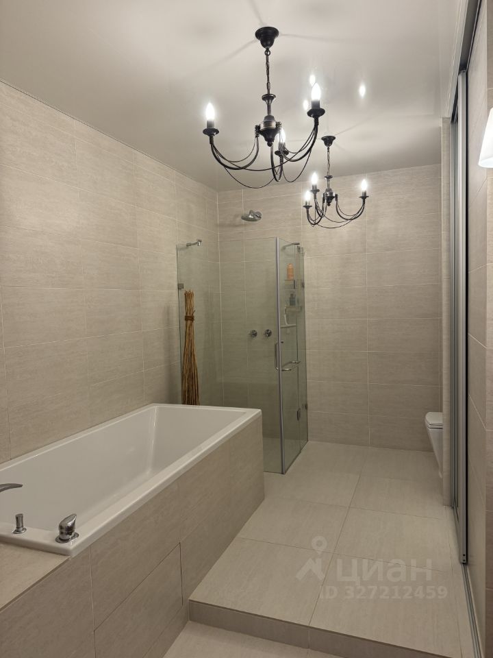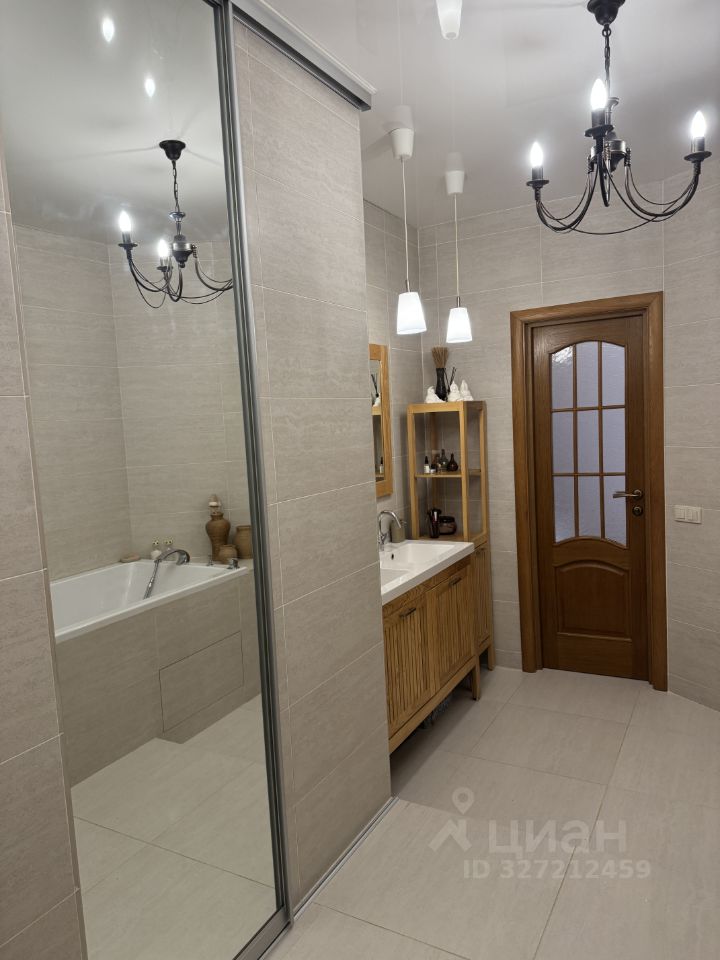 Просторная ванная комната (12 кв.м) с душевой кабиной, ванной, нишей для хранения за большим зеркалом.