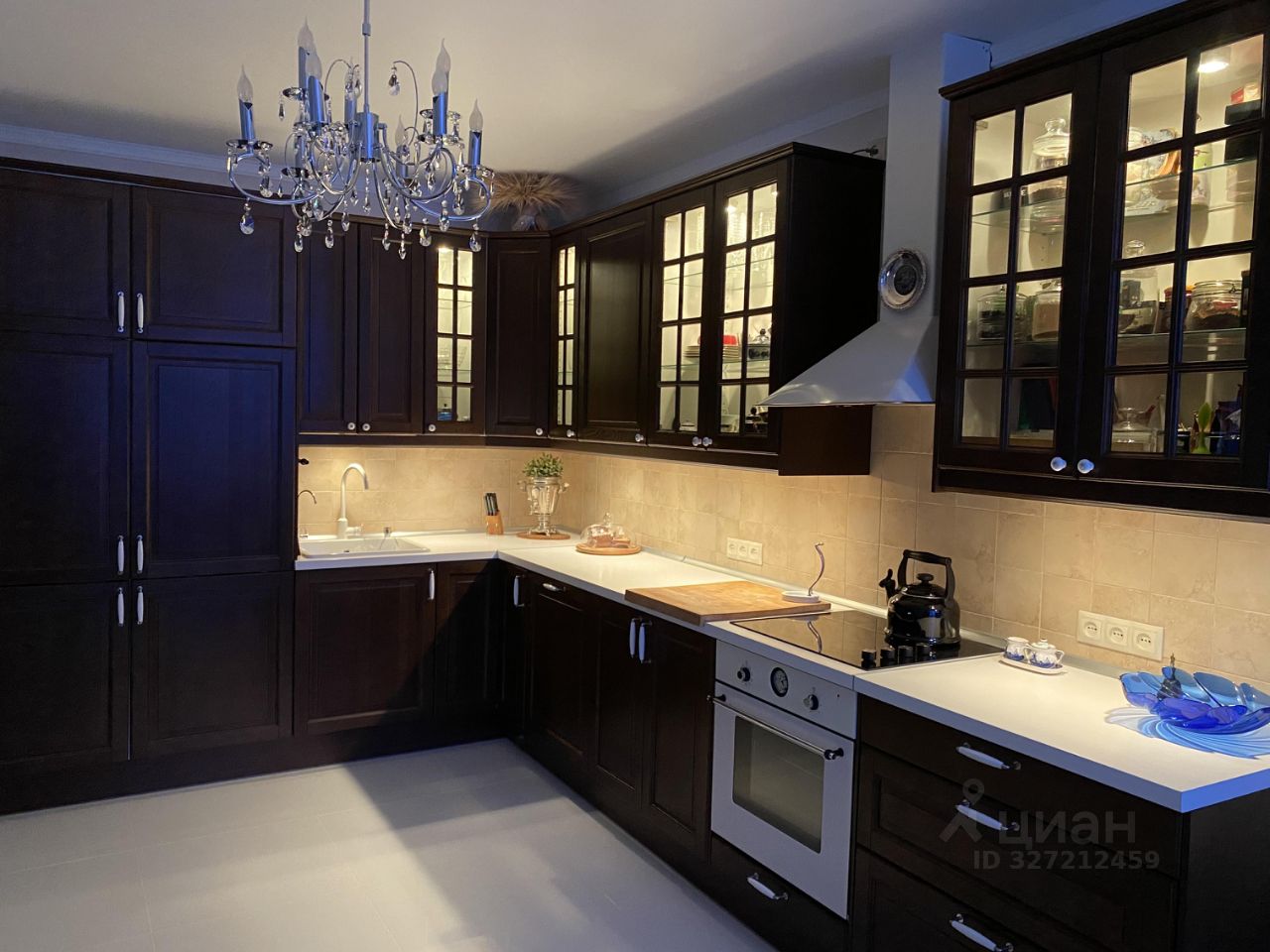 Кухонный гарнитур из массива со встроенной техникой Electrolux эл. варочная панель, духовой шкаф, 2 встроенных холодильника, посудомоечная машина.