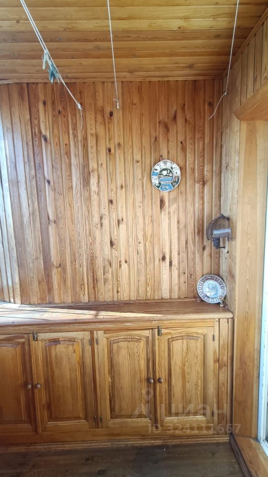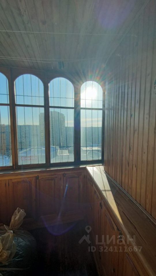 Лоджия остеклена, обшита натуральным деревом, установлена металлическая решетка.