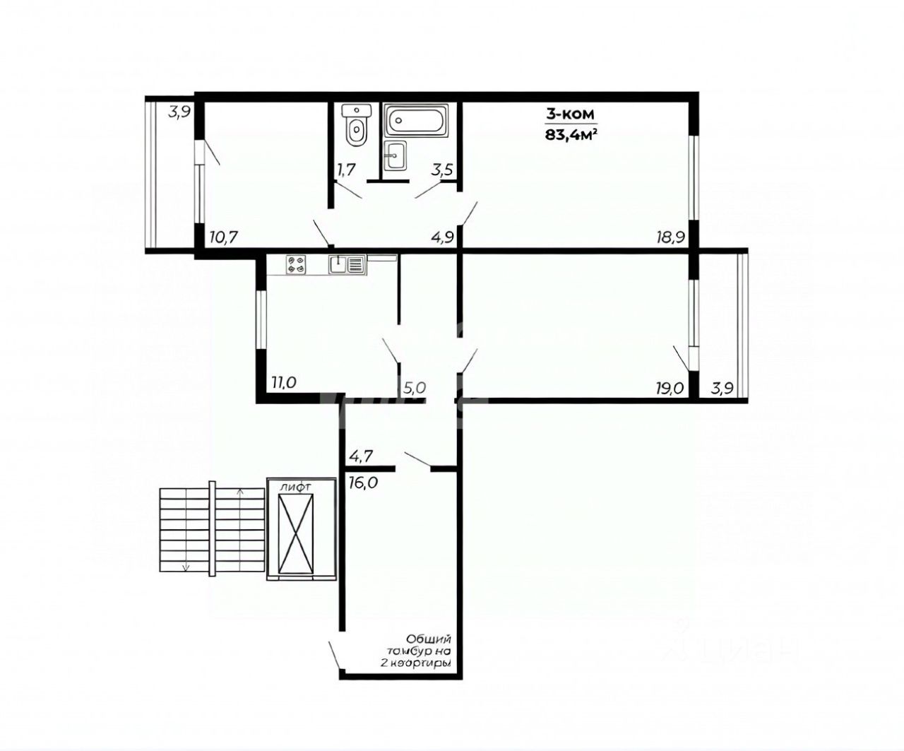 Простор и комфорт (83.4 м²): Три изолированные комнаты, раздельный санузел. Огромный общий тамбур (19 м²) на две квартиры с местом для хранения — дополнительное полезное пространство! Две лоджии на восток и запад — целый день светло и уютно.