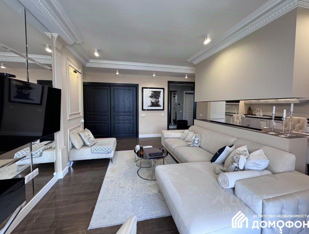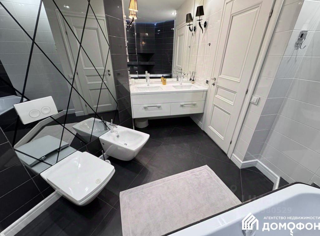 Стены и потолки идеально выровнены и оклеены обоями европейского качества. В качестве покрытия пола кухни, коридора, и гостиной использована плитка. Покрытие двух остальных комнат - ламинат. Межкомнатные двери изготовлены из массива дерева. Современная металлическая входная дверь. Во всех комнатах предусмотрено несколько сценариев освещения: от мягкого и уютного вечернего света до яркого освещенных зон. Ванная комната облицована современным керамогранитом с устройством теплого пола. Кухонный гарнитур изготовлен по индивидуальному заказу и оборудован встроенной техникой. В каждой комнате имеется кондиционер.