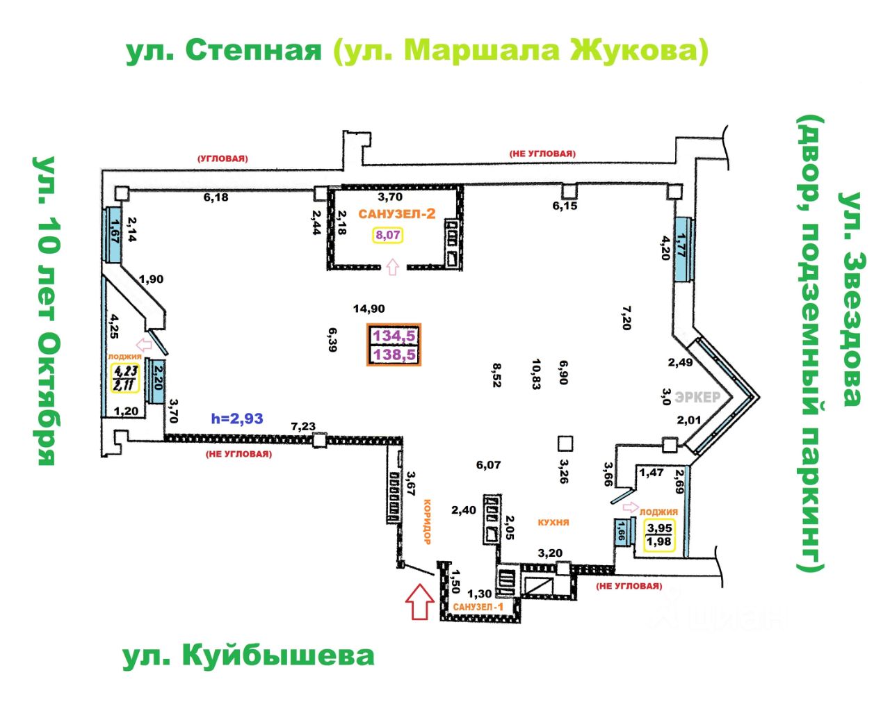 В центре города, на чистой продаже, просторная, с высокими потолками, 3-х комнатная квартира (количество окон позволяет сделать 4-х комн.), свободной планировки, под отделку, 134,5 кв.м. без учёта двух застеклённых лоджий, и 138,5 кв.м. (с учётом лоджий). Не угловая. С эркером. Установлены счётчики: тепла, воды, электроэнергии. Удачный третий этаж (середина). На площадке всего три квартиры. Имеется пандус. Грузовой лифт. Дом сдан в декабре 2023 года. Во дворе современная детская площадка и подземный паркинг. Рядом: остановка ''Городской музей'' (пересечение улиц 10 лет Октября и Куйбышева), дет. сады 96,51, Гимназия 146, школа 132, банки, магазины, Театральная площадь. Документы готовы. Возможен быстрый выход на сделку. Обременений нет. Несовершеннолетних нет. Один взрослый собственник.