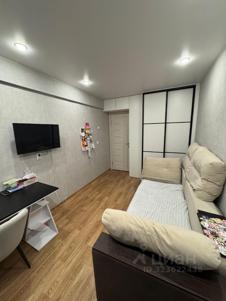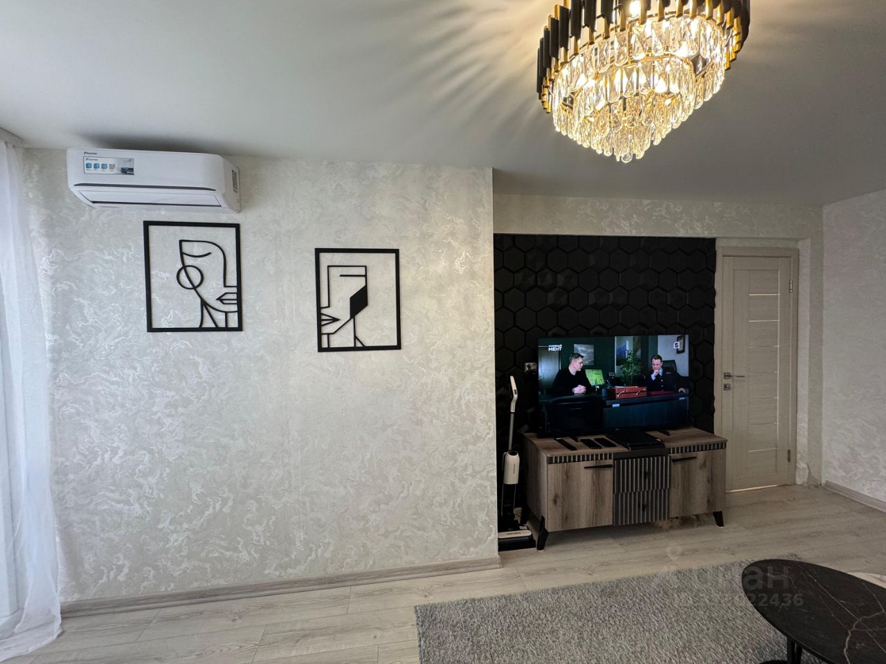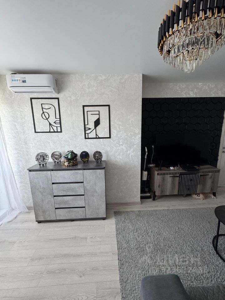 Во всей квартире установлены натяжные потолки с точечными светильниками. Санузел раздельный. Стены и пол облицованы кафелем современного образца, установлена новая сантехника и полотенцесушитель. Произведена замена водопроводных труб. На кухне стены до потолка, полностью, облицованы современным кафелем. Акцентная стена над обеденной зоной оформлена в виде арочной ниши с точечными светильниками. В гостиной установлен кондиционер. Имеется балкон с выносом балконной рамы, что позволило увеличить площадь верхней части балкона до 30 см., а также оборудовать на балконе подоконники для цветов. Остекление балкона ПВХ профилем. Внутренняя отделка пластиковыми панелями. При продаже в квартире остаются три современных шкафа- купе и угловой кухонный гарнитур.